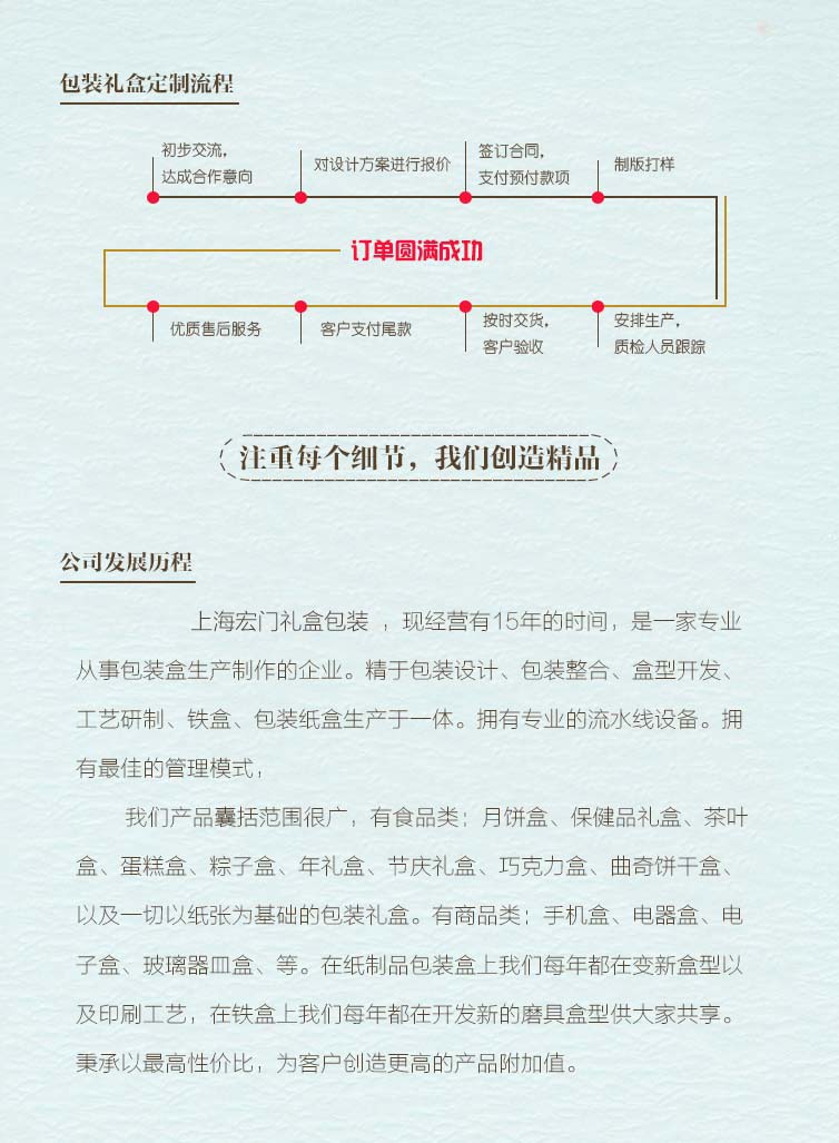 上海宏門禮盒包裝,現經營有15年的時間,是一家專業從事包裝盒生產制作的企業。精于包裝設計、包裝整合、盒型開發、工藝研制、鐵盒、包裝紙盒生產于一體。擁有專業的流水線設備。擁有最佳的管理模式, 我們產品囊括范圍很廣,有食品類:月餅盒、保健品禮盒、茶葉盒、蛋糕盒、粽子盒、年禮盒、節慶禮盒、巧克力盒、曲奇餅干盒、以及一切以紙張為基礎的包裝禮盒。有商品類:手機盒、電器盒、電子盒、玻璃器皿盒、等。在紙制品包裝盒上我們每年都在變新盒型以及印刷工藝,在鐵盒上我們每年都在開發新的磨具盒型供大家共享。秉承以最高性價比,為客戶創造更高的產品附加值。