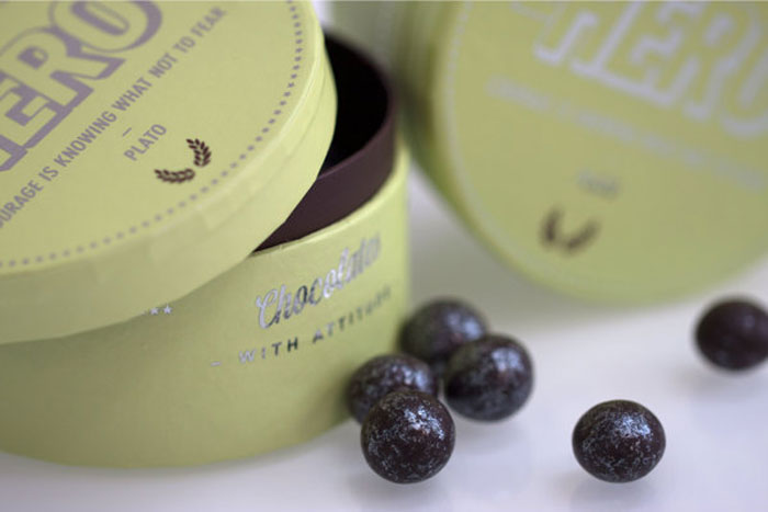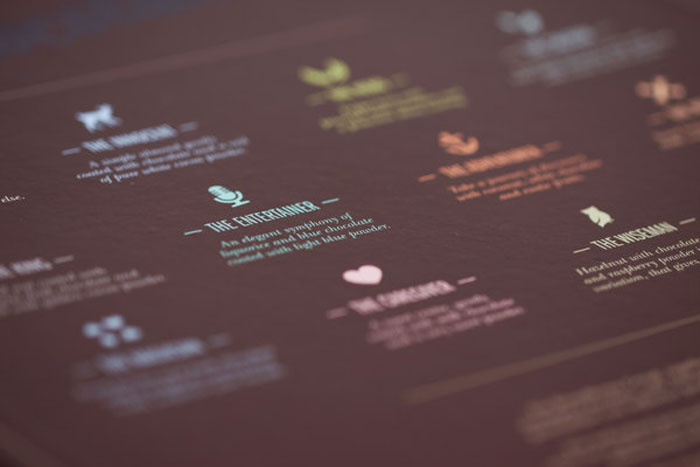 “個性是通過一個獨特的報價,一個獨特的設計和獨特的類型的巧克力表達。設計區分了12種不同的字體,字體的使用,這些小字體是圓形的,像是小帽子。巧克力是可口精品巧克力獨特的配方了。一切都是從地上發展的。”
